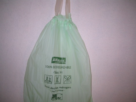 Die Abfallsäcke sehen aus wie normale Plastiksäcke. Aber sie sind zu 100% abbaubar wie andere organische Materialien. Hergestellt aus Mais. Erhältlich hier bisher nur beim Grossverteiler Leclerc.
