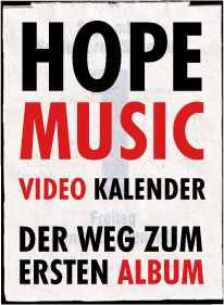Hier siehst du einen faszinierenden Video Kalender über eine vielversprechende junge Band aus Biel. Begleitet und gefilmt von den mindestens ebenso vielversprechenden Jungfilmern von ton-und-bild: HOPE MUSIC hier klicken! dann Teaser oder Trailer etc.