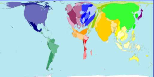 Weltkarten können auch nach ganz anderen Kriterien als nach der tatsächlichen Landfläche dargestellt werden. Nachfolgend eine Weltkarte, die die Getreideproduktion der einzelnen Länder proportional wiedergibt.