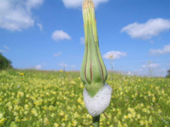 Zickadenschaum an Bocksbart. Die Blume öffnet sich am Morgen und ist um 12 Uhr schon wieder geschlossen…. 28 Stundenwoche in Frankreich? Im Hintergrund Klappertopfwiese.