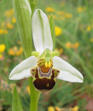 Und hier wieder mal eine Sexualtäuschblume: Die Lippe der hell- bis dunkelrosa (selten weiss) blühenden Ophrys apifera ist einer Biene nachgebildet. Sie braucht allerdings gar keine Biene mehr anzulocken um sich fortzupflanzen. Denn sie ist autonom und bestäubt sich selber. Hierfür gleiten die Pollinien schon sehr früh aus den Pollenfächern, die Stielchen krümmen sich und bringen den Pollen auf die Narbe.