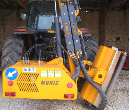 Mit dieser Maschine (Debroussailleuse) mähe ich zur Zeit diverse Weg-und Strassenböschungen. Mit der rechten Hand steuere ich 10 verschiedene Bewegungen des Mäharms und mit der linken Hand lenke ich den Traktor. Die Füsse sind auf Kupplungs- Brems- und Gaspdalen. Hohe Konzentration ist erforderlich, damit die Baumstämme nicht verletzt werden und der Schlegelmäher vorsichtig den Bodenunebenheiten folgt. Alle Bewegungen werden durch einen ingenieusen Oeldruckmotor erzeugt. Es braucht viel Übung, bis sich eine gewisse Routine einstellt.