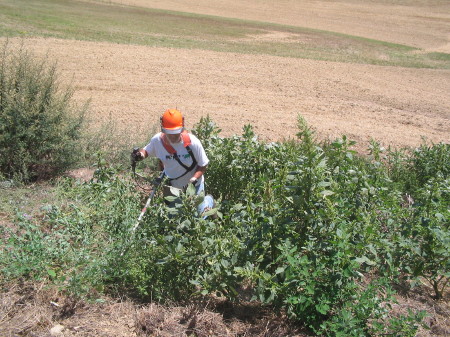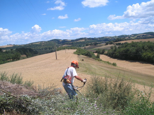 Die Motorsense ist eine „gäbige“ Maschine. Dem Gestrüpp und den Dornen würde man im unwegsamen und steilen Gelände sonst kaum mehr Meister. Ich habe die Ausläufe der Drainageleitungen freigelegt, unter den Nussbäumen gerodet, damit man später die Nüsse einsammeln kann und diverse Wassergräben freigelegt. Harte Kochenarbeit eben…