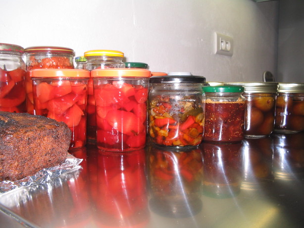 Stephanies Tagwerk (von links nach rechts):Zucchini-Cake, süss-saure Quitten, Pasta-Gemüse in Olivenöl (Zucchini, Peperoni, Tomaten, Auberginen), Feigenkonfitüre, Feigen in Zuckersirup, Brombeerkonfiture……