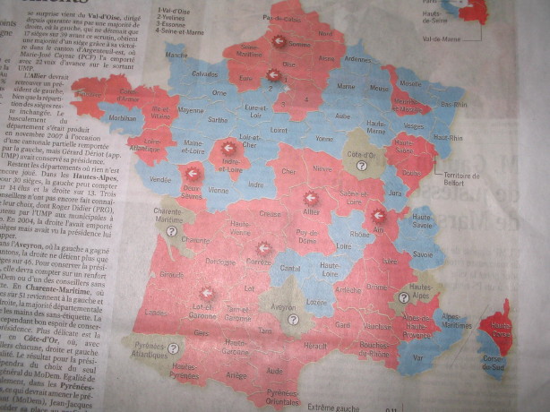 Vor 10 Jahren regierte die Rechte noch in 77 Departementen, jetzt steht es 56 zu 45 zu Gunsten der Linken! Hand aufs Herz, das ist nicht weil die Linken plötzlich viel die besseren Kandidaten haben, sondern dank den Eskapaden des …. Staatschefs.