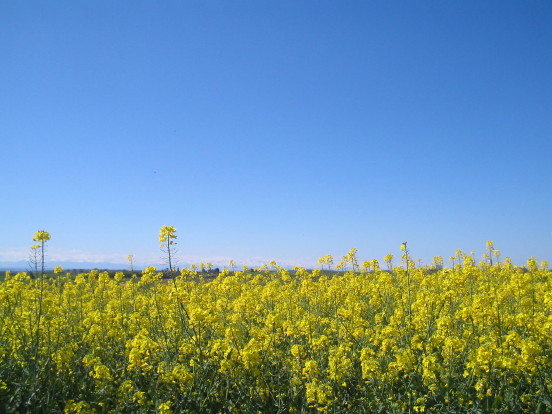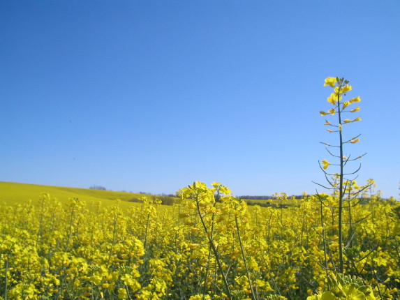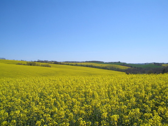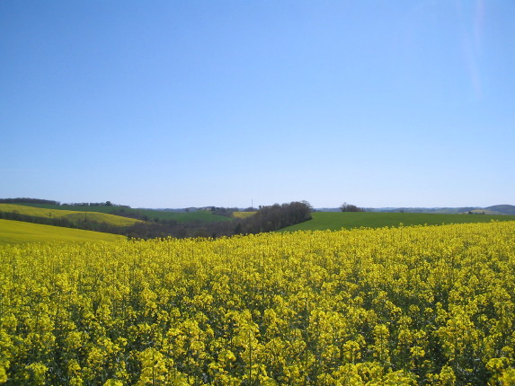Die gelb leuchtenden Rapsfelder überziehen zur Zeit die Hügellandschaft des Gers.