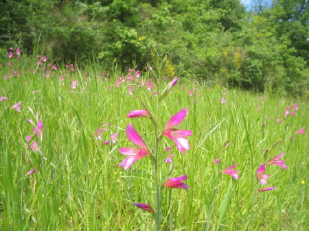 Tägliche Gewitterregen, Toulouse in Weiss nach Hagelschlag, wahrlich kein Heuwetter. Dafür bei uns immer noch ein Meer von wilden Gladiolen….