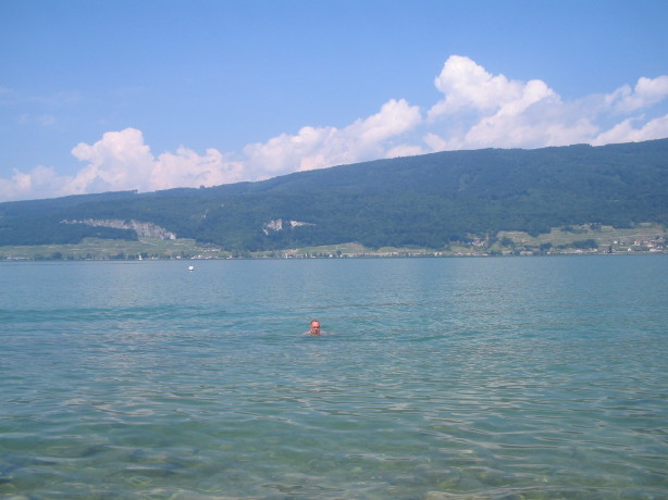 Es lächelt der See, er ladet zum Bade (oder so ähnlich). Im Bild der Auswanderer kurz vor der Ankunft nach der heldenmütigen Überquerung des Bielersees…. (nicht nachmachen!)