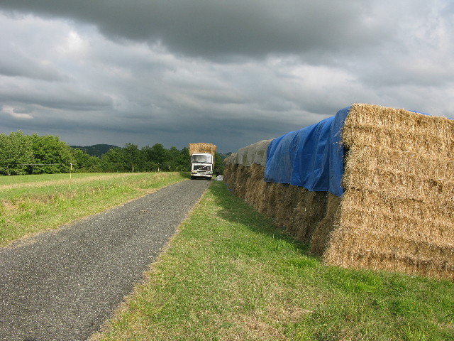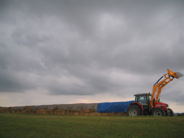 Das drohende Gewitter hat uns veranlasst, unsere Heustapel mit Blachen abzudecken… natürlich hat es dann nicht geregnet. Wir sind eben gebrannte Kinder: vor vier Tagen hat ein nicht angesagtes, kurzes aber heftiges Gewitter in der Nacht 22 mm Niederschlag gebracht und einen bereitgestellten Heustapel gewässert!