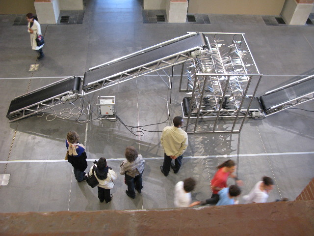 Stellvertretend für all‘ die Kunstwerke präsentiere ich hier eine Installation von Fabrice Gygi, 1965, Genève, im Musée les Abattoires unter dem sinnigen Titel Fliessband für Massentierschlachtung…(Werkbeschrieb)