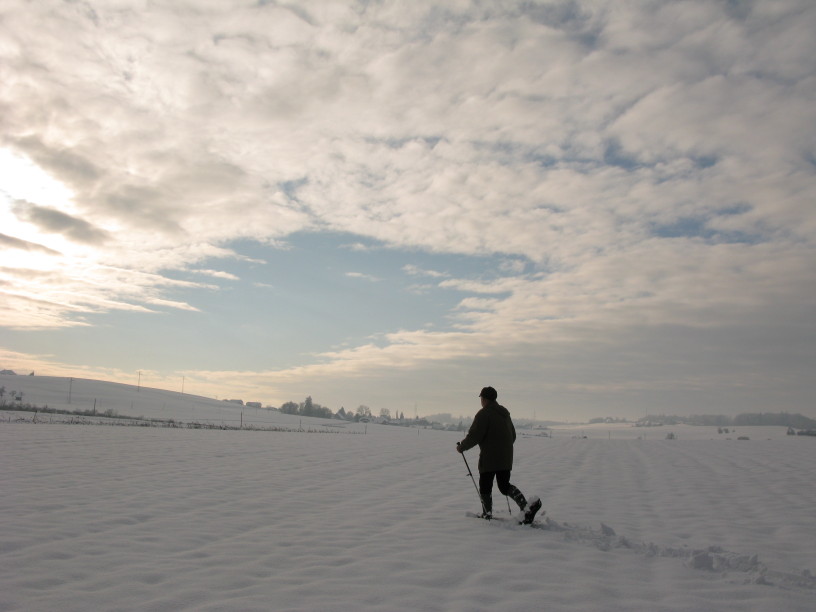 Es ist schön, wieder mal mit Schneeschuhen durch tief verschneite Landschaften zu wandern. Der Schnee mag vielerorts ein Chaos auslösen, aber er verzaubert auch die Landschaft, umhüllt die Dörfer und verschluckt den Lärm der Umgebung….