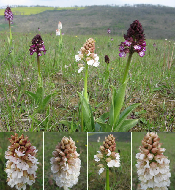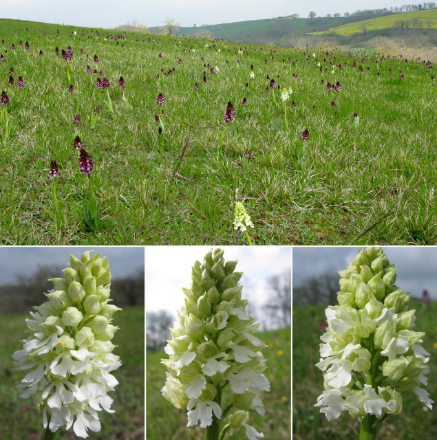 Neben den reinen Albinos gibt es auf der gleichen Wiese auch noch 5 weitere Orchis purpurea mit einer Farbanomalie.