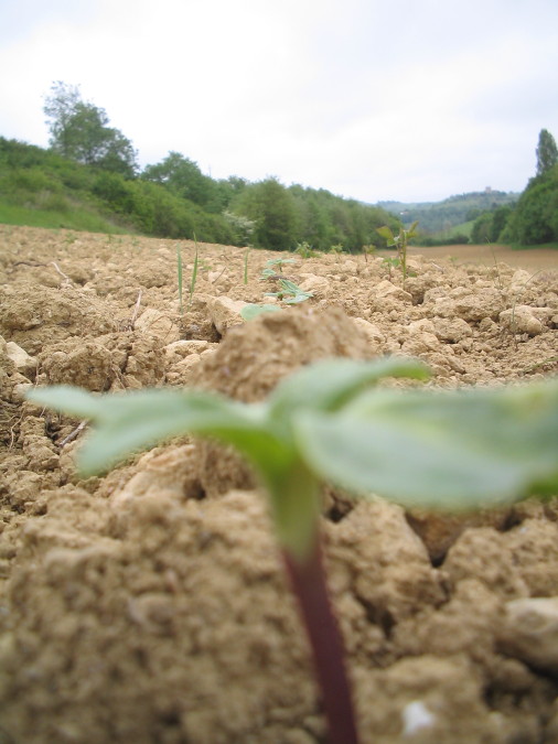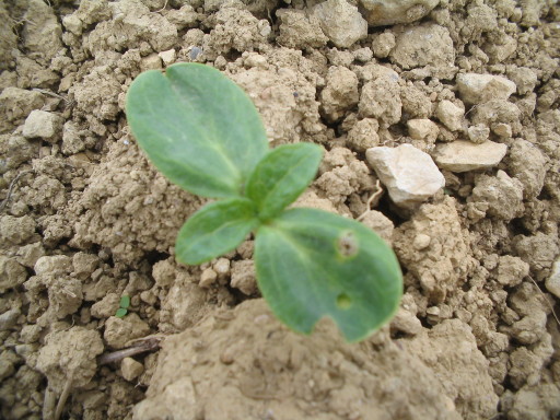 Die Sonnenblumen sind schön aufgelaufen. Allerdings werden die Keimblätter bei dem regnerischen Wetter durch die Schnecken attakiert. Im konventionellen Landbau werden die Schneckenkörner zusammen mit dem Saatgut ausgebracht und die Sonnenblumensamen sind chemisch gegen allerlei Schädlinge gebeitzt… Wir im Biolandbau dürfen keine chemischen Hilfsmittel einsetzen und müssen mit Verlusten rechnen und daher die Saatmenge etwas höher ansetzen. Durch die mechanische, statt chemische Unkrautbekämpfung werden die Kulturpflanzen zusätzlich etwas dezimiert.
