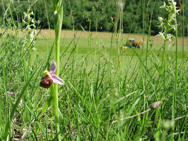 Die einen heuen, die andern laufen den Orchideen nach:Im Vordergrund Ophrys du Gers, im Hintergrund MF 6270…