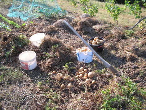 Die Kartoffel-Selbstversorgung funktioniert auch im trockenen Südwesten. Zwar sind die Böden humusarm und dafür stein- und tonreich (argilleux-calcaire) und alles andere als geeignete Härdöpfuböde… Wir pflanzen die Kartoffeln nicht in, sondern nur auf den Boden und decken sie danach mit einer dicken Strohschicht ab. Das ausgraben geht so sehr viel leichter und die Erträge sind gut.