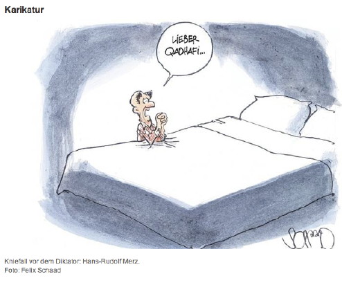 das publizierte bild von schaad ist in jeder beziehung richtig: das leere bett steht für den inhalt der nachrichten rund um die ‚lybien-krise‘. ein kurzer blick in die internetausgaben von ‚le monde‘ und ’sueddeutsche‘ – mit der jeweils eingebauten suchfunktion – fördern nichts zu tage, das im zusammenhang relevant wäre. letzte nachricht von ‚le monde‘ die ’suisse‘ betreffend stammt vom 12. august 2009!!!ueli
