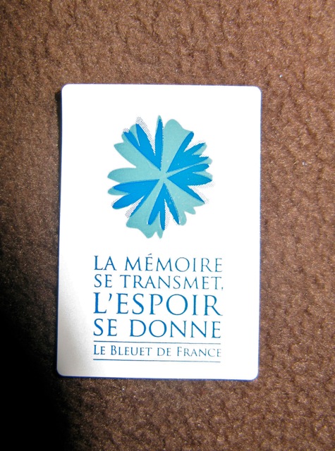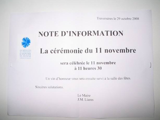 Der 11. November ist in Frankreich ein Feiertag. In jeder Gemeinde werden in Gedenken an den Waffenstillstand 1918, der den verlustreichen 1. Weltkrieg beendete, Blumen und Kränze niedergelegt. In jeder noch so kleinen Gemeinde Frankreichs steht auf dem Dorfplatz ein Gedenkstein mit den Namen derer, die im ersten Weltkrieg umgekommen sind: Mort pour la France.