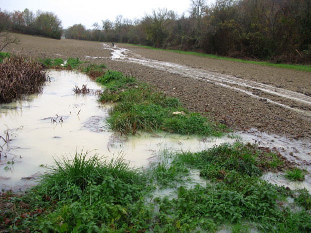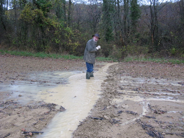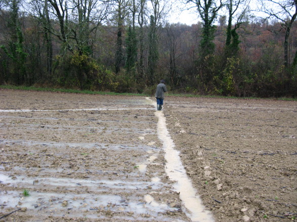 Starke Regenfälle in der letzten Nacht haben dazu geführt, dass unsere sonst häufig trockenen Bächlein (Ruisseau de la Ouaitte und Ruisseau d’Embarrut) plötzlich viel Wasser führen und das angrenzende Kulturland teilweise überschwemmt haben. Ärgerlich, weil die gesäten Bohnen gerade gekeimt haben und nun stellenweise abgeschwemmt wurden. Ich habe mich den ganzen Tag bemüht, Gräben zu schaufeln um Wasser um- und abzuleiten. Hard work! Das isch haut buuret!