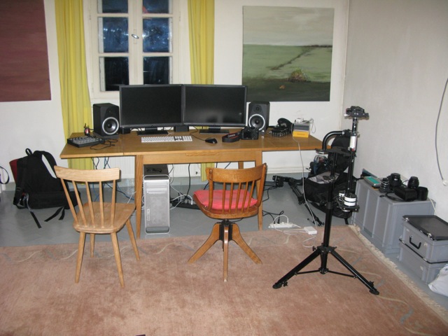 Man erlebt ja so Einiges im Lauf der Jahre. Manche Besucher haben nicht mal die Zahnbürste mit, wenn sie hier ankommen. Das kann man bei unserm Aeltesten nicht sagen: einen Tag nach seiner Ankunft ist unsere Wohnung kaum mehr wieder zu erkennen. Alles was hier steht: graue Kisten, Bildschirme, Boxen etc. wurde in einem kleinen Peugeot hierher transportiert…… und da wird jetzt gearbeitet…. das fägt….. in zwei Wochen herrscht hier wieder gähnende Leere.