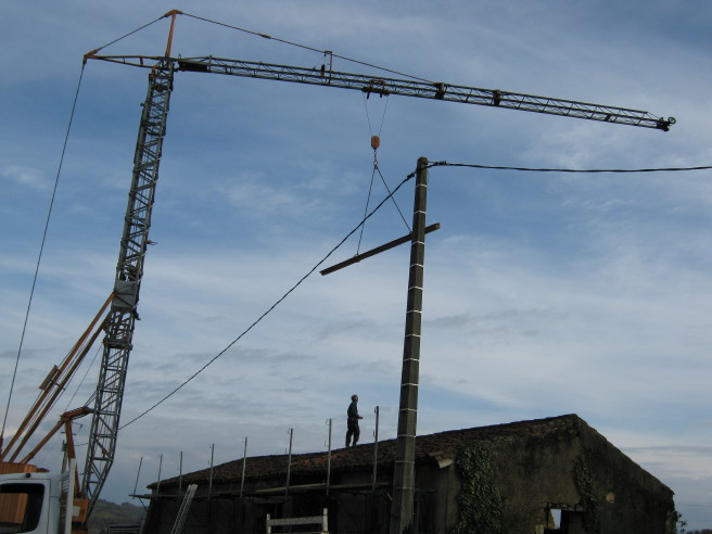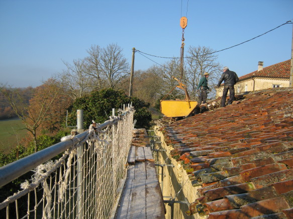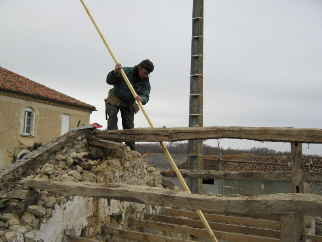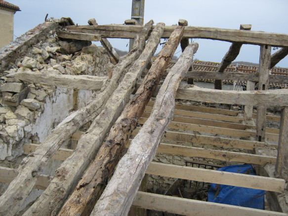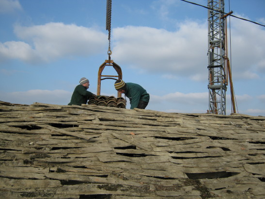 In zwei Tagen sollte das Dach abgedeckt und die noch brauchbaren Rundziegel ausgesondert sein. Anschliessend beginnt die Zimmermannsarbeit am alten Dachstuhl…