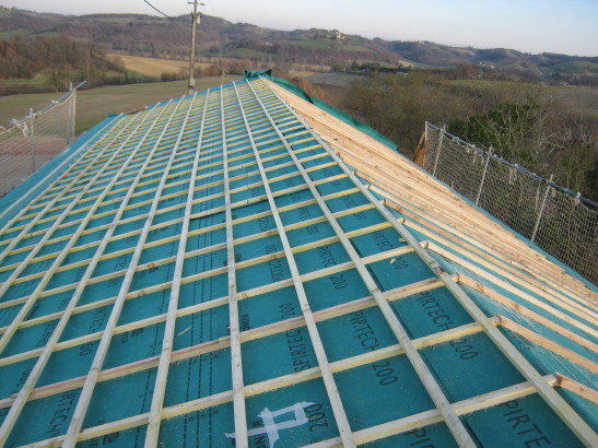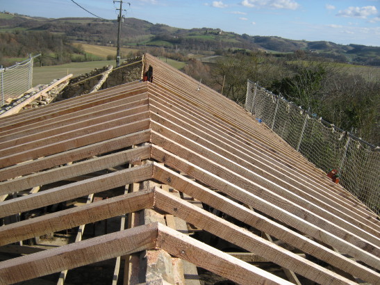 Die erste Etappe ist geschafft: Dachstuhl ist repariert und die Nordseite des Daches nach allen Regeln der handwerklichen Dachdeckerkunst fertiggestellt. Jetzt warten wir auf die Lieferung der 80m2 Solarpanels für die Südhälfte des Daches und der Ondulatoren (Stromumwandler). Der Photovoltaïk-Boom in Frankreich hat dazu geführt, dass zur Zeit offenbar für gewisse Materialien Lieferengpässe entstanden sind.