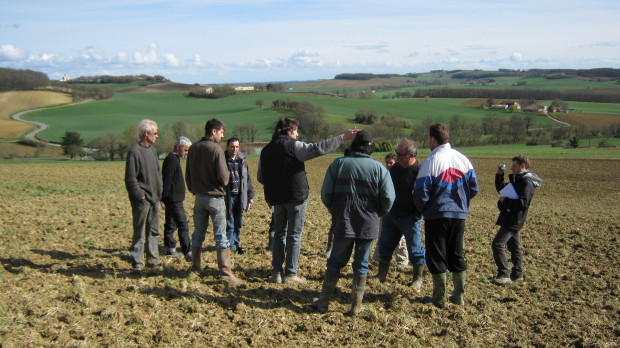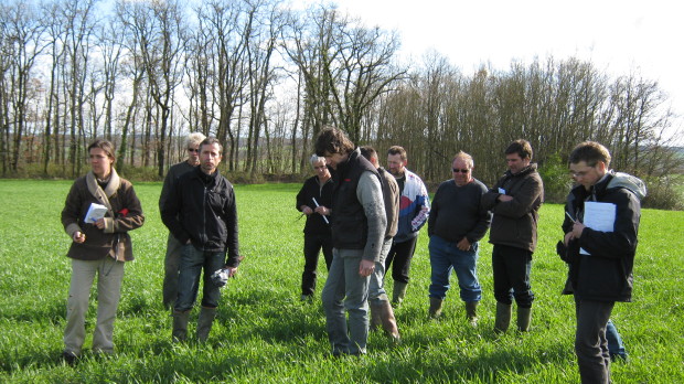 Das Groupement des Agriculeurs Biologique et Biodynamique du Gers (GABB 32) hat zu einer Weiterbildungs-Veranstaltung eingeladen. Die Flurbegehung fand auf dem Hof von Pierre Pujos in Saint Puis statt. Auf dem Programm standen u. a. „Blé tendre sur luzerne et féverole binée en sol argilo-calcaire (semis dans luzerne partiellement détruite)“. Eine gute Gelegenheit zum Gedankenaustausch und Fachsimpeln unter den immer noch nicht sehr zahlreichen Biobäuerinnen und -bauern im Gers.