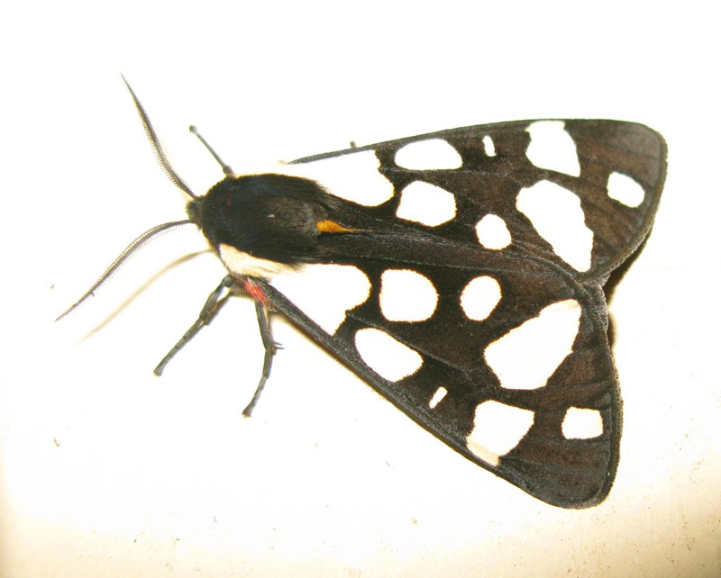 Dieser heisst Schwarzer Bär Arctia villica und ist auf der Oberseite unscheinbar schwarz-weiss und auf der Unterseite leuchtend farbig: