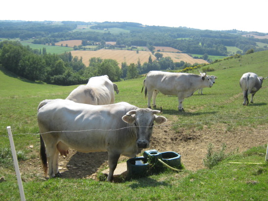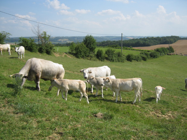 Das ist die kleine Herde von Klaus und Gabriele Schröder. Sie züchten Mirandaise-Kühe, eine alte gascognesche Kuhrasse, die früher oft als Zugtiere eingesetzt wurde.