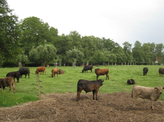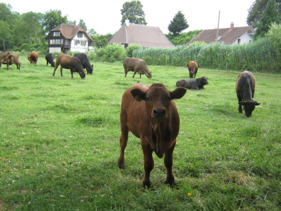 Wir sind auf dem Biohof Inselmatt z’Visite. Es ist fast so heiss wie in SW-Frankreich. Die Angus- Aubrac- Herde hat es gut auf der schattigen Waldwiese…