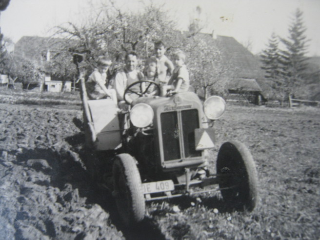 Das war vor 56 Jahren auf der Inselmatt: mein Grossvater Otto Röthlisberger auf seinem Hürlimann (Benzin/Petrol) begleitet von einem Lehrling und einer grossen Kinderschar (meine Geschwister und ich) beim Pflügen mit Selbsthalterpflug.