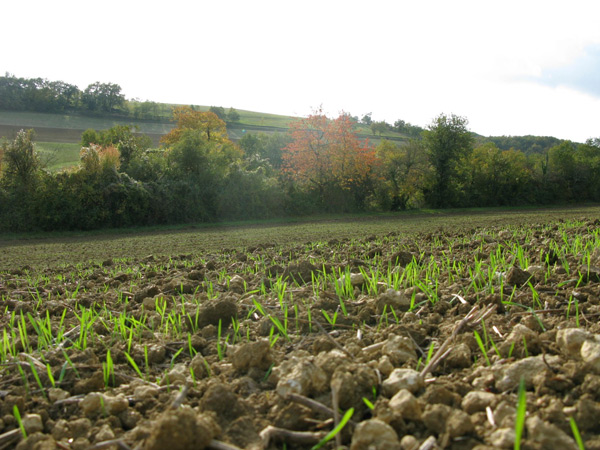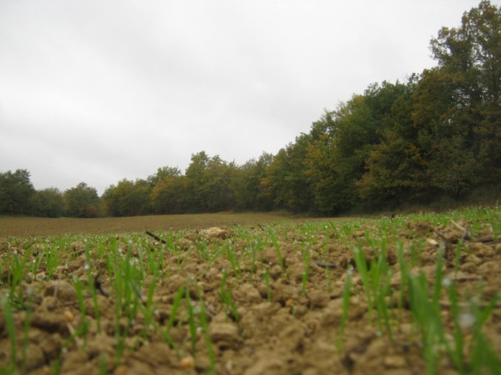 Am 18. Oktober habe ich dieses Feld gesät. Schon sind die ersten Keimlinge sichtbar. Biobrotgetreide zur Ernährung der Welt. Was, wenn sich die Saatkörner einmal weigern würden zu wachsen? Das Pflanzenwachstum ist und bleibt ein Wunder der Natur!