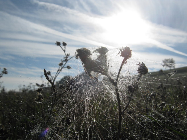 Wie dem auch sei. Unsere Matten und Äcker sind jedenfalls zur Zeit mit Spinnengeweben übersät. Im Morgentau sieht das phantastisch aus.