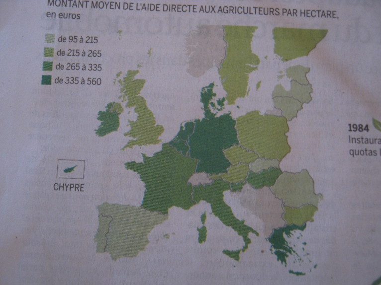 Gemäss dieser Grafik erhalten Bauern in der EU jährlich zwischen 95 und 560 €uros pro Hektare Direktzahlungen (DZ). Wir beispielsweise erhalten für unseren 70 ha grossen Hof 140 €/ha.