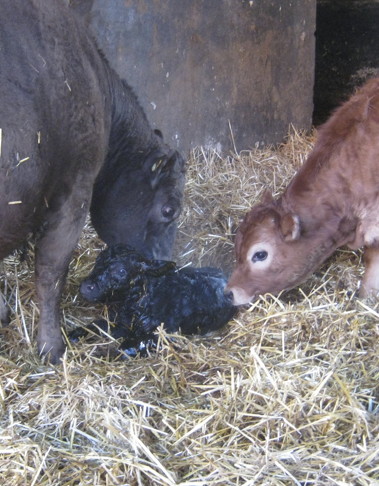 Eben auf die Welt gekommen! Munikälblein, schwarz wie die Nacht, Angus, wird von Mutter „gepflegt“ und interessiert von Halbschwester beschnuppert, Mutter und Sohn wohlauf…