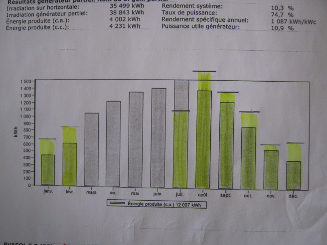 Solarpanelfläche 80 m2, Inbetriebnahme 13. Juli 2010, Stromverkauf an EDF 0.60 €/kWh