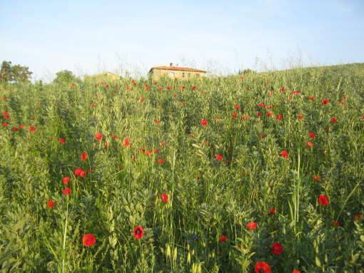 und schöne toskanische Häuser inmitten leuchtender Mohnblumen…