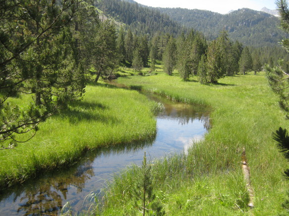 In einer Stunde sind wir von Traverères aus in den Pyrenäen. Und kurz danach in Spanien, im Val d’Aran. Hier befindet sich das Quellgebiet der Garonne, die hier Era Garona heisst. Wir sind auf einer Wanderung im Circ de Colomers und bewundern die Artenvielfalt, die Moorgebiete, die Bachläufe, die Bergseen, die Föhrenwälder… eine Wohltat für alle Sinne!