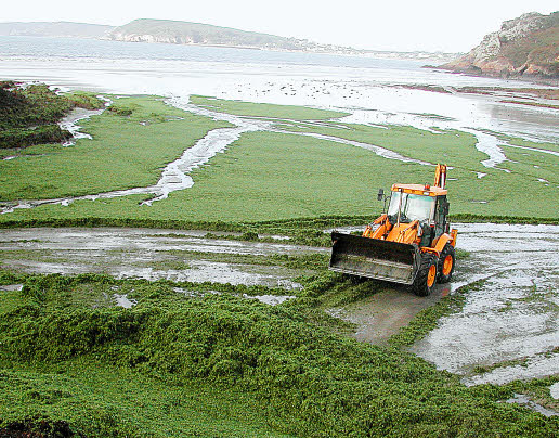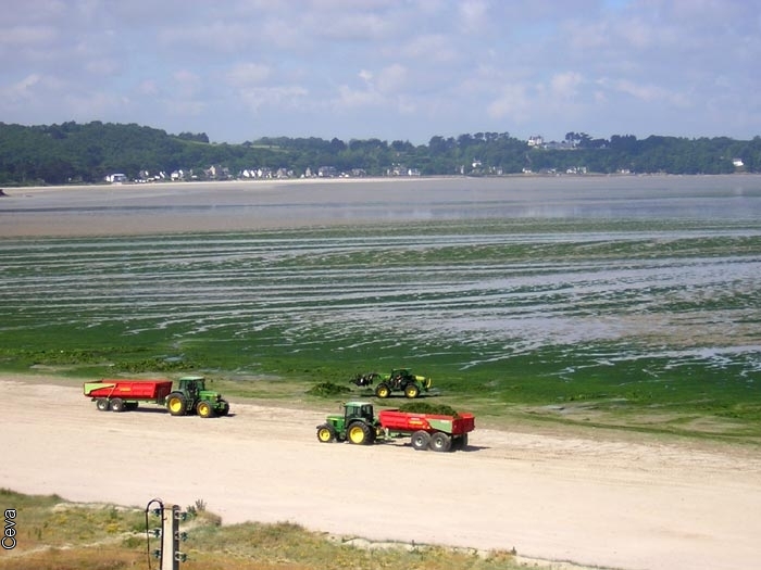 Seit Jahren wird die Badesaison an der bretonischen Atlantikküste durch einen immer dichter werdenden Algenteppich beeiträchtigt bzw. verunmöglicht. Die intensive Tierhaltung in der Bretagne führt dazu, dass die Oberflächengewässer mit Nitrat und Posphor überlastet sind und im Küstenbereich die Grünalgen so spriessen lassen, dass von uneingeschränktem Badevergnügen keine Rede mehr sein kann. Längst sind einzelne Gemeinden in der Bretagne und neuerdings auch in der Normandie dazu übergegangen, die Algenteppiche jeden Tag maschinell abzutragen.