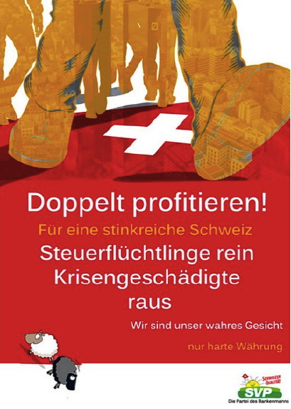 Wir sind dieser Tage auf Schweiz-Besuch. Der Empfang war herzlich. Praktisch an jeder SBB-Station prangt in grossen Lettern: „Masseneinwanderung stoppen!“ Dazu im Stil der Nazipropaganda schwarze Stiefel die auf das Schweizerkreuz treten. „Kosovare schlitzt Schweizer auf!“ Hetzpropaganda auf Schritt und Tritt. Jetzt fehlt nur noch der Judenstern und Parolen „Juden raus!“ und man wähnt sich in Deutschland der dreissiger Jahre.