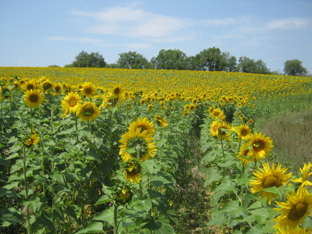 Leider, leider sind die meisten Sonnenblumen im Gers schon wieder verblüht. Gestern fand ich allerdings ein Feld, das noch in voller Blühte steht! Ich kann mich jeweils fast nicht sattsehen!