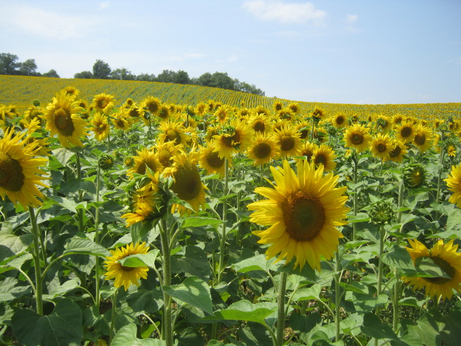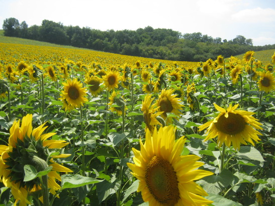 Leider, leider sind die meisten Sonnenblumen im Gers schon wieder verblüht. Gestern fand ich allerdings ein Feld, das noch in voller Blühte steht! Ich kann mich jeweils fast nicht sattsehen!