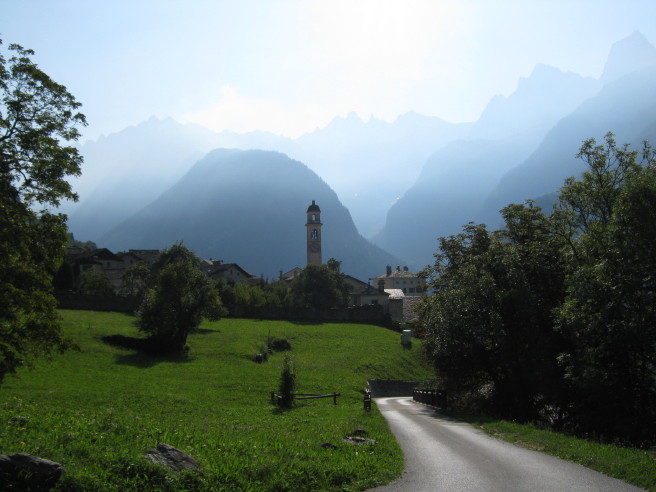 „La soglia del paradiso“ (Die Schwelle zum Paradies), so bezeichnete der Maler Giovanni Segantini, der hier einige Jahre überwinterte, Soglio. Von diesem alten, auf einer sonnigen Hangterasse 1090 m.ü. M. gelegene Dorf hat man einen einzigartigen Blick auf das darunterliegende Tal und die majestätischen Gipfel der Sciora-Gruppe auf der anderen Seite.