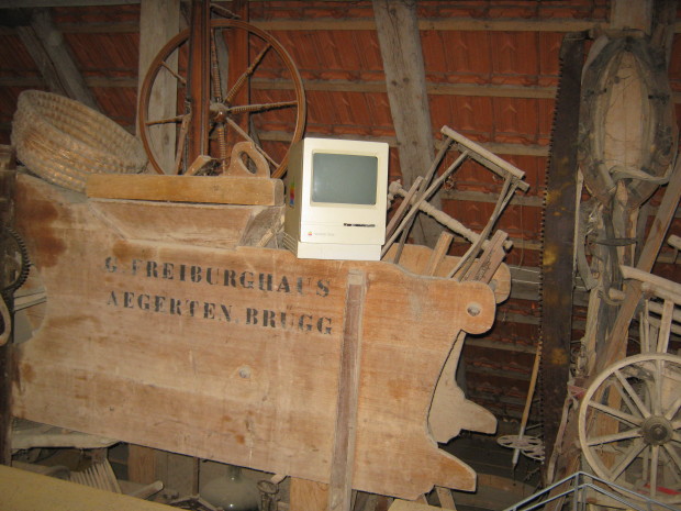 Inzwischen ist unser Macintosh längst auf dem Estrich bei all den anderen verstaubten bäuerlichen Gerätschaften, die unser Leben (und auch das unserer Vorfahren) geprägt haben. Wir haben unseren Mac 1985 für teures Geld (ca. 6000 sfr.!) gekauft, nachdem wir auf einem Commodore die ersten Computererfahrungen gesammelt hatten. Und wir waren damals sogar in New York, um die verschiedenen Modelle zu evaluieren! Seitdem sind Apple-Compis unsere täglichen Begleiter!