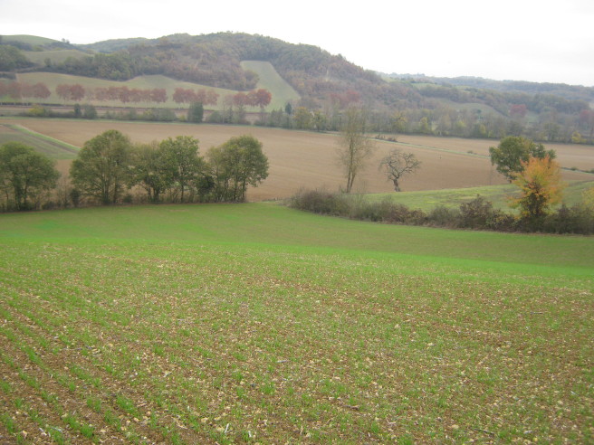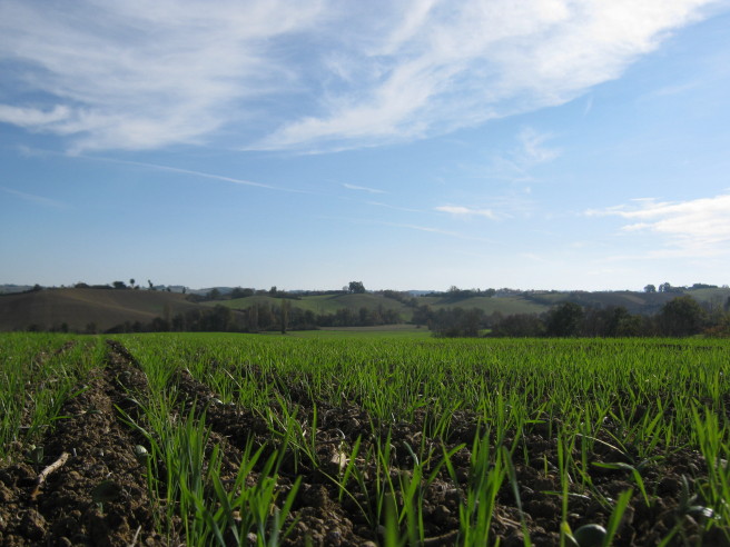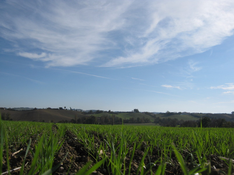 Die in Reih und Glied gesäten Getreideäcker im Gers zeigen sich in der warmen Novembersonne von ihrer schönsten Seite! Hier wächst unser und euer täglich Brot!