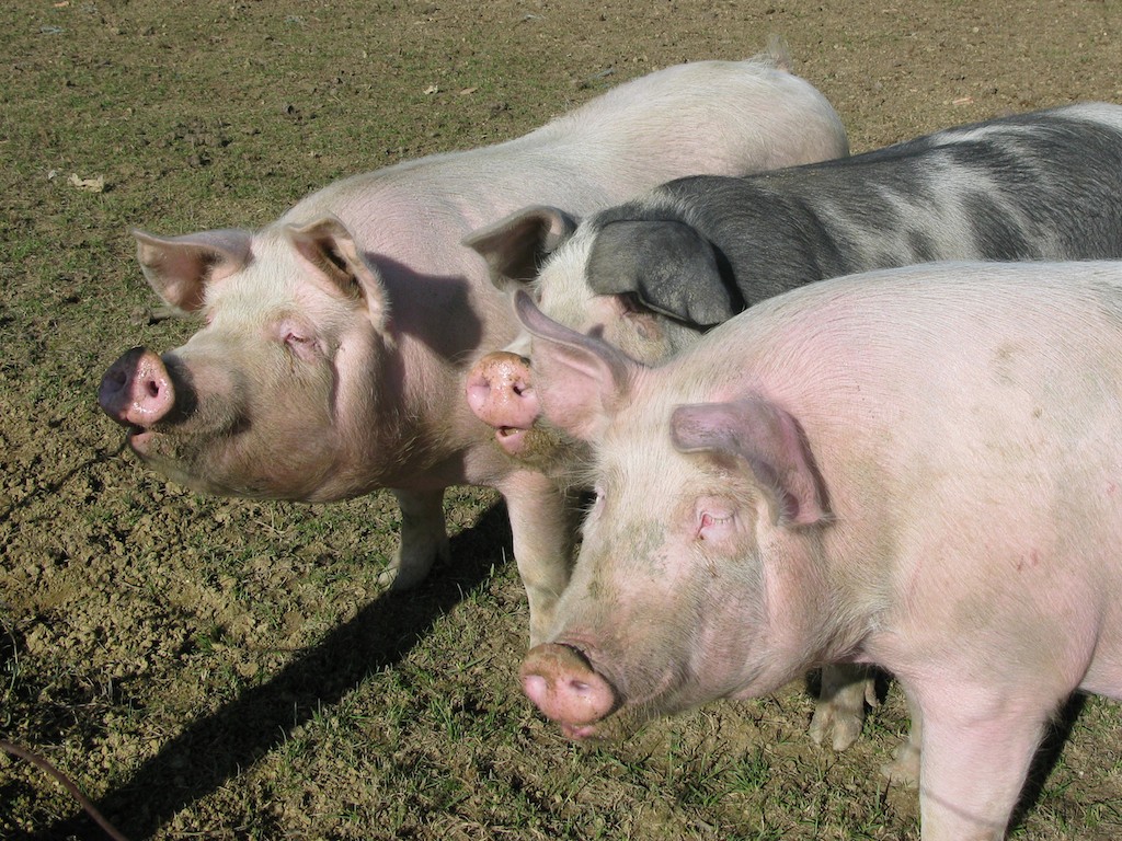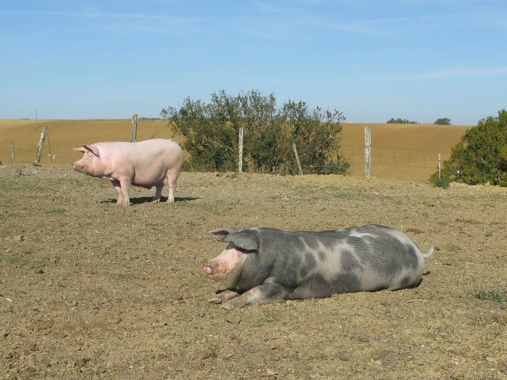 Noch gibt es sie, die glücklichen Schweine. Es scheint dass diese drei Muttersauen dazugehören. Wir haben sie auf einer grossen, sonnigen Weide mit Panoramablick auf die Pyrenäen entdeckt…