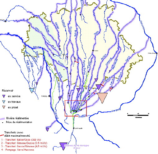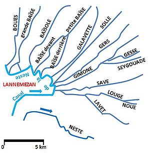 Der Canal de la Neste wurde vor 150 Jahren gebaut. Er ist der Ursprung des ganzen Bewässerungssystems für die Gascogne. Das Schmelzwasser aus den Pyrenäen wir auf dem Plateau de Lannemezan auf die einzelnen Flüsse und Bäche aufgeteilt, die dann so alimentiert in ihrem Lauf gegen Norden als ideale Bewässerungskanäle für die Landwirtschaft dienen.