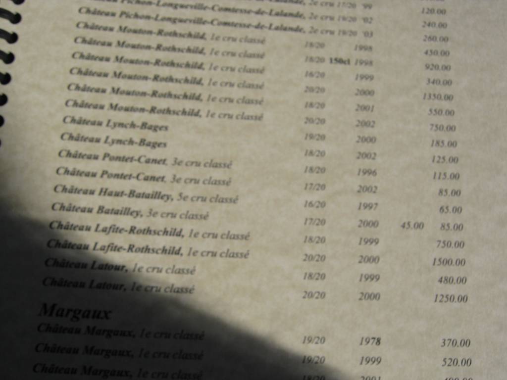 Erstes Beispiel: In einem Gartenrestaurant im graubündnerischen Maloja wage ich einen Blick in die Weinkarte. Flaschenpreise zwischen 100 und 1000 Franken! Ein Château Lafite Rothschild wird für sage und schreibe lächerliche 1500 Franken angeboten….