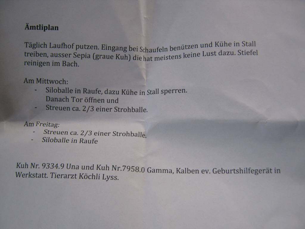 … meine Betriebshelferdienste in der Schweiz. Auf meinem Ämtliplan steht unter anderem die Betreuung und Fütterung der Mutterkühe und der Ziegen. Schöne Abwechslung zu den Feldarbeiten in Frankreich. Vielleicht chauberet ja noch das eine oder andere Muttertier…