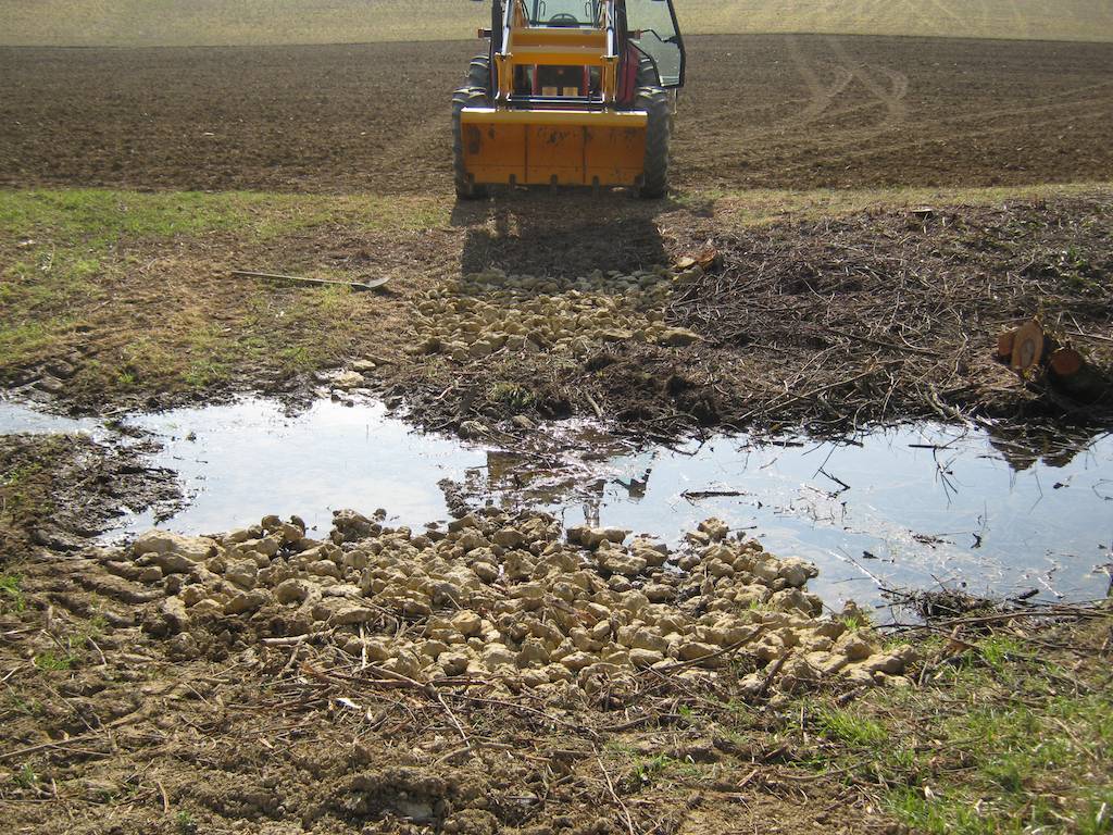 Brückenbauer ist leicht übertrieben. Aber immerhin gibt es, wenn es fertig ist, einen primitiven Durchgang für Mähdrescher und Traktoren. Und Steine hat es ja nach wie vor genügend auf den Ackerböden.
