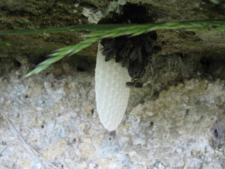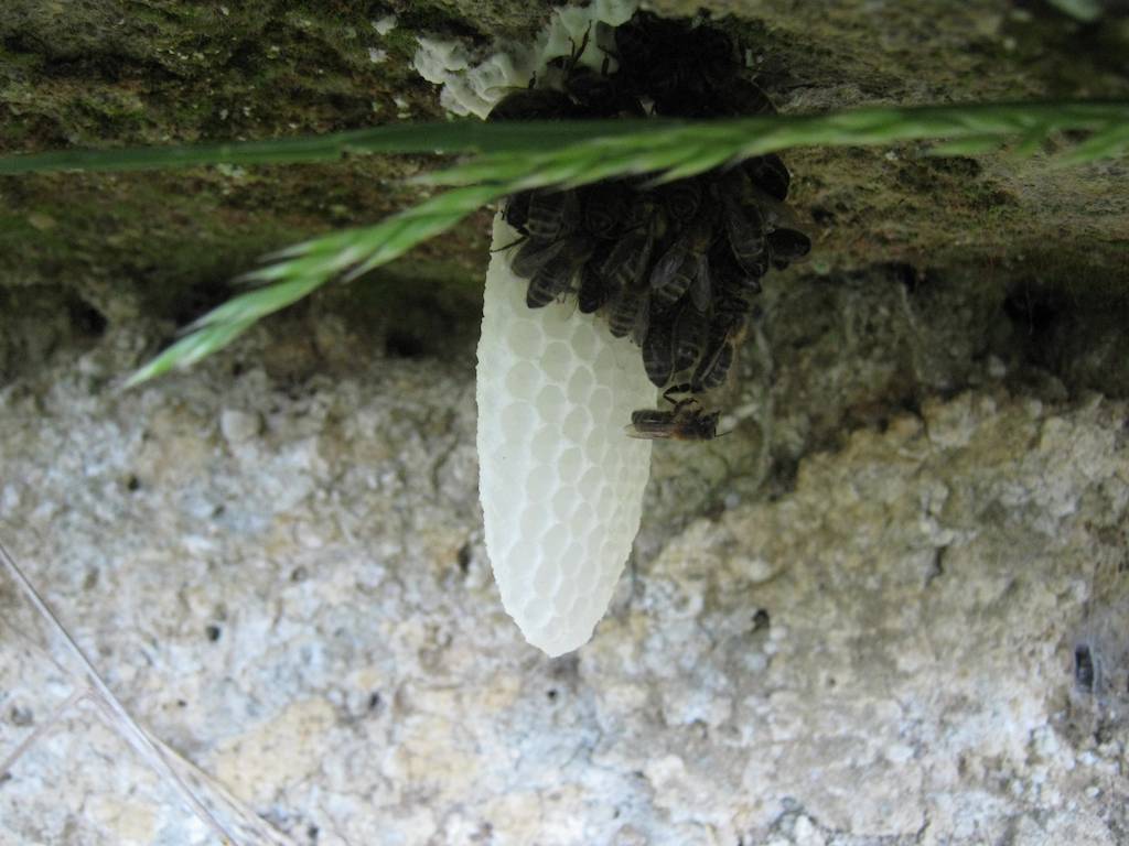 Nach nur zwei Tagen hat das Bienenvolk seine „Zweitwohnung“ schon wieder verlassen. Der avisierte Imker kam zu spät, um das Volk mit Königin einzufangen. Alles was heute morgen bleibt, ist eine weisse, kleine Bienenwabe und ein paar wenige Bienen die offenbar (noch) nicht mit ihrem Volk abgereist sind…